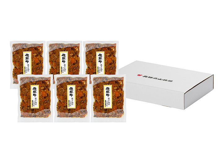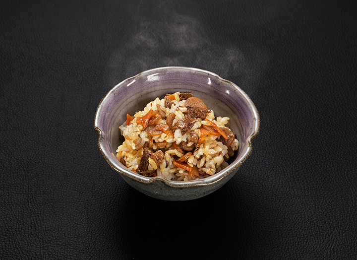 飛騨牛の切り落としを使った炊き込みご飯の素です。切り落としはご飯にまんべんなく混ざり、食べた時の食感も楽しめるように約1cmのダイスカットに。また地元の生産者が丹精込めて作る干しシイタケ、採れたてを細かくカットした新鮮なゴボウやニンジンも一緒に醤油ベースのだしで煮込みます。ご飯と一緒に炊き込むだけで本格的な炊き込みご飯の完成。野菜の風味や肉の甘味がご飯にしっかりとなじみ、何杯でも食べたくなります。
